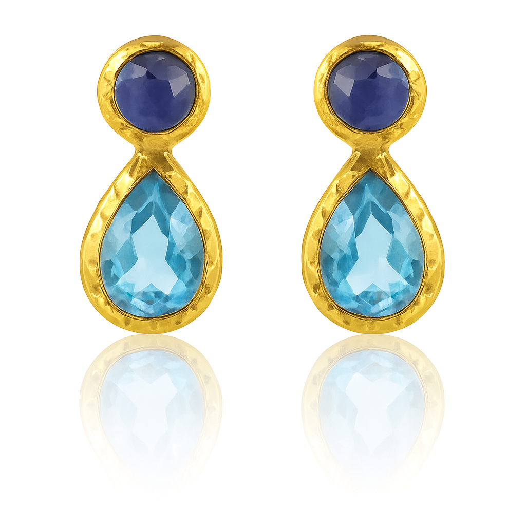 Set in hand-hammered 18K gold-plated sterling silver, the top features the deep indigo of Iolite while the bottom showcases the sparkling clarity of Blue Topaz. The hammered finish catches the light beautifully, offering a dynamic texture that shifts as you move.