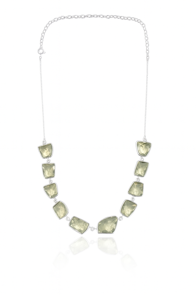 Reminiscent of the soft green hues of Icelandic moss growing between glaciers, this faceted green amethyst necklace radiates calm renewal. Its subtle color and icy transparency evoke serenity and balance. With an adjustable sterling silver chain, you can wear it high for sophistication or longer for effortless layering.