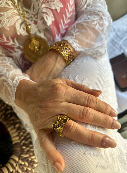This limited-edition Indian-inspired mosaic bracelet pays homage to the rich heritage of Jaipur, the gemstone capital of India. Reminiscent of the colorful bazaars and intricate Mughal architecture, this striking statement cuff features 51 hand-cut tourmaline stones, carefully selected for their natural brilliance. The lush pinks, deep greens, golden ambers, and soft blush hues of tourmaline reflect the vibrant energy of Rajasthan’s bustling streets, ornate palaces, and vivid textiles.