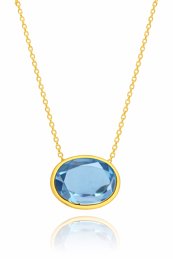 Inspired by the effortless elegance of Italy, our Floating Oval Pietra Necklace features a luminous blue topaz that appears to float within a sleek, gold-plated sterling silver bezel. The soft, ocean-blue hue of the stone evokes the sparkling waters along the Italian coast, from Capri to the Amalfi shoreline.
