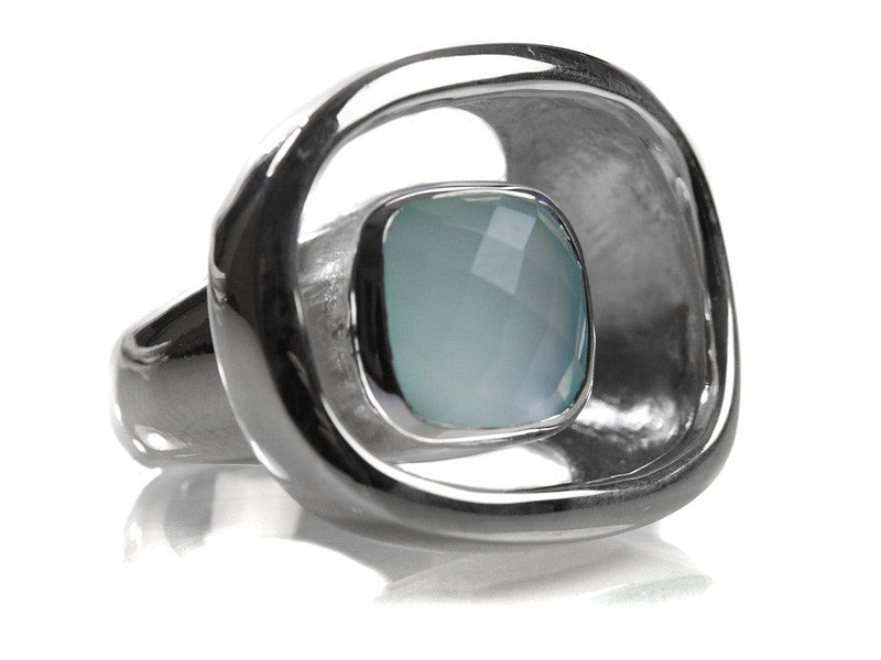 This ring is from the India Mantra Collection. While one end of the sterling silver band holds the faceted aqua chalcedony stone, the other end wraps into wide oval shape around the stone. This is truly an artistic piece that is great for everyday or dressy wear!