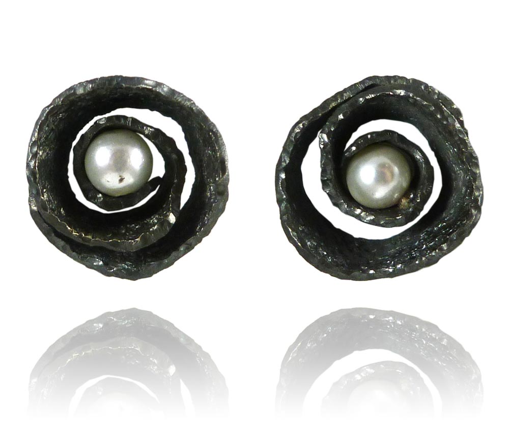 From our Spain collection, these unique earrings feature a pearl at the center of an oxidized sterling silver swirl. These studs are one-of-a-kind and sure to impress!