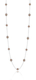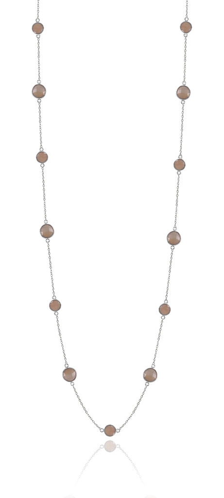 This surprising stone has a warm, neutral tone with a silvery shimmer, making it ideal to pair with any outfit! The subtle shine of the stones is offset by the glamorous length of the whole necklace, lending a bold sophistication to the design.