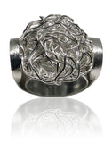 Threads of silver wire wrap around and cross over each other creating a unique and hand-crafted feel to this ring from our Egypt collection. The sides of the rings have a brushed finish, and the band itself has both an inner and outer wall, which supports the web of silver both from the bottom and on the sides. Classic and dynamic, this ring makes a subtle statement.
