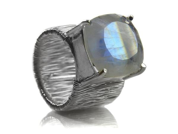This ring is inspired by modern Italian fabrics. It is classic in style with a unique criss-cross wrap band design. It can be worn casually or for an elegant evening out.