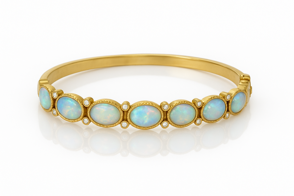 This limited edition Indian-inspired mosaic bracelet features 48 hand cut fused sapphires. The majestic stones mingle together in a striking yet elegant combination, all set in 18K gold vermeil. This bold statement piece is sure to get you many compliments!