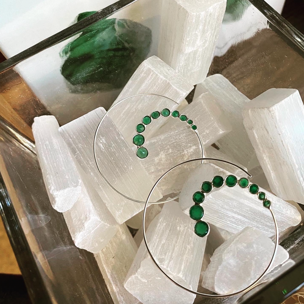 Discover a fresh take on our best-selling swirly earrings with our latest design. Featuring ten faceted Green Onyx stones artfully arranged to swirl around each earring, this pair offers a modern twist on traditional Indian hoop design, showcasing our unique modern fusion style. These versatile earrings can be worn through the front or back, depending on your preference, ensuring you'll look inspirational from any angle.
