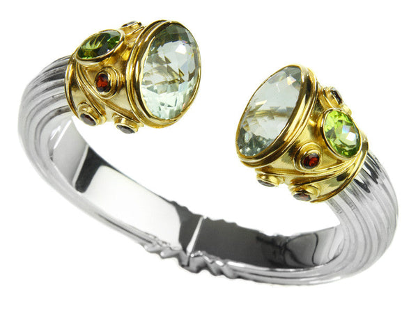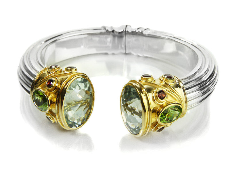 Guaranteed to garner as much attention (but less of a stir) as the serpent from which it is inspired, this bracelet is the ultimate "wow" piece. Originally introduced to the Sikara line as a test design, this sterling silver and 18k gold plated bracelet quickly became a best-seller and, ultimately, a permanent fixture in our Indian collection. The hinged-spring base gives way to the open top design where semi-precious stones are inlaid with intricate Indian detail in 18k gold plating. Worn just as well with cocktail dresses as with jeans, this bracelet can stand alone for a classic look or stack with other bracelets for a more accessorized statement. For a complete look, pair the bracelet with the Serpentine Ring and Earrings available in various gemstone options.