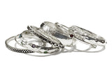 This set of stackable rings includes 7 individual rings of different widths and styles. Some are smooth, some are hammered, some have stones and some are classic.
