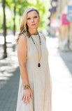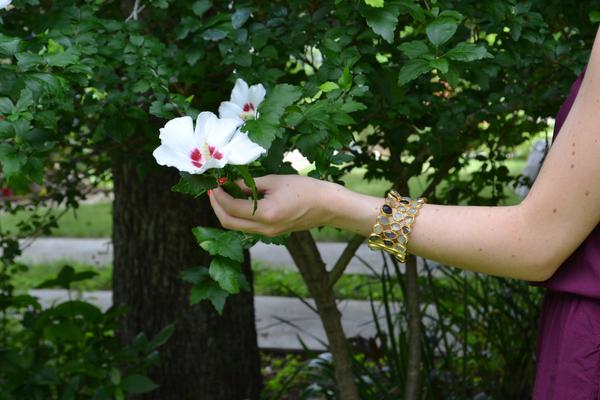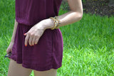 This limited edition Indian-inspired mosaic bracelet features 51 hand cut stones and clasps shut with a single pin. The beautiful greens, blues and purples of Prehnite, Labradorite, Iolite and Aquamarine mingle together in a striking yet elegant combination, all set in 18K gold vermeil. This bold statement piece is sure to get you many compliments!
