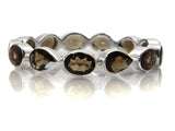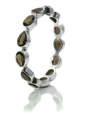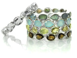 Inspired by peacocks, the national bird of India, this gemstone bangle features approximately twelve faceted stones in the shape of the brilliant bird feathers. The handcrafted silver bangle sparkles enough to stand alone, but also looks great stacked with other bracelets. Available in two sizes and several stone options, be sure to specify which size and stone when checking out.