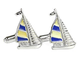 These stainless steel sailboat cufflinks feature a splash of color in the sails and are rhodium plated. These cufflinks are the perfect accessory for the captain of the ship.