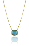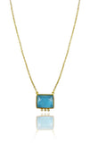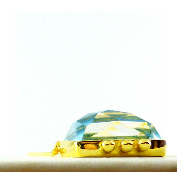 This modern necklace embodies the serenity of the sea. Clear glass, cut and faceted, sits on top of a calming blue base, studded with tiny reflective flecks. From the side, the blue color refelcts up through the glass, just as shades of blue reflect up through the beautiful waves of the Sea of Galilee. Three miniature crystals decorate the bottom of the pendant, catching the light like white-caps on the waves.