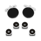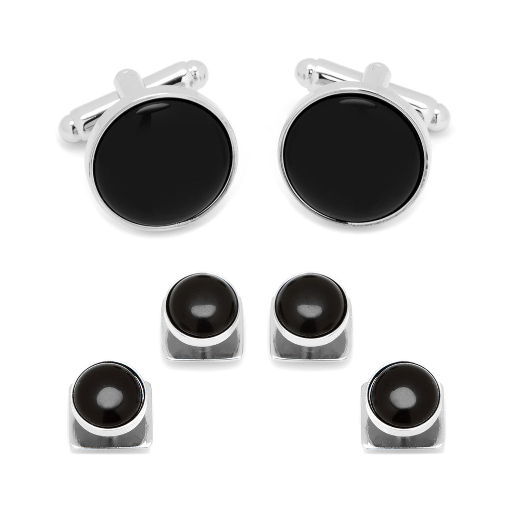 Onyx insets capture the look of luxe for your formal wear. Silver and Onyx Stud Set is a simple, yet refined way to lend sophistication and class to your tux. Stud set features 2 cufflinks and 4 studs for a suitable way to dress up. Stud Set comes with 2 Ox & Bull Trading Co. boxes, one for your cufflinks and another for your studs. Stud set by Ox & Bull Trading Co.
